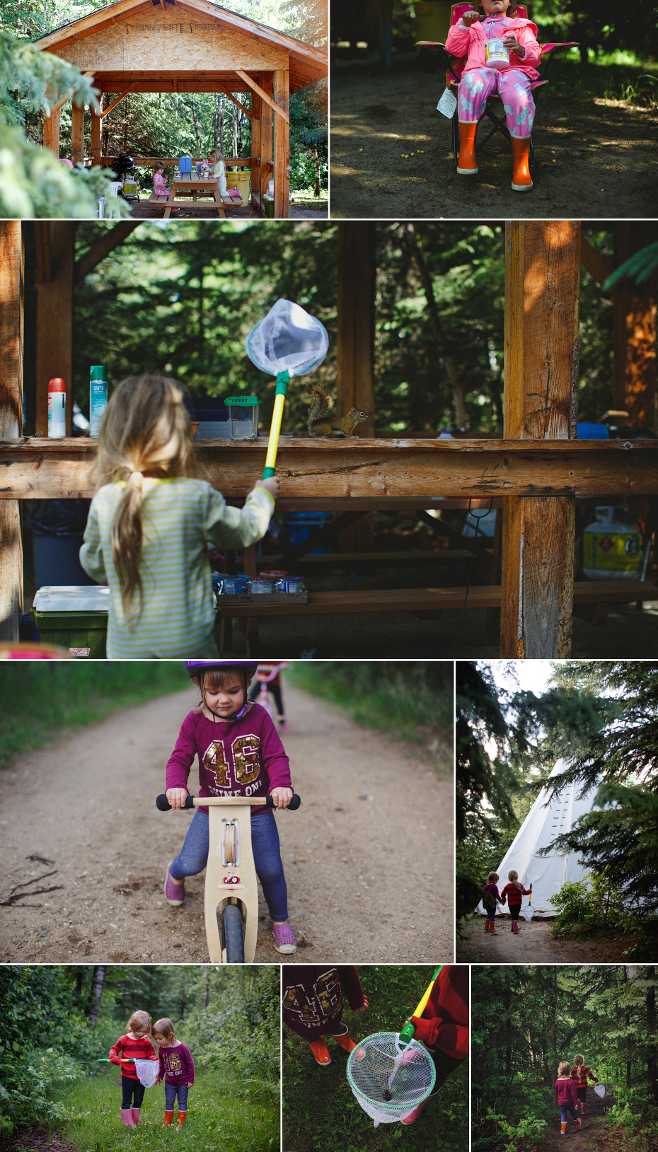 The campground is primarily an RV park, but there is a back section with two “trapper’s cabins” and four tipis.  They can be rented for the evening or just for the day (great idea for birthday parties or a family BBQ). I was a little worried about the fact that there was no playground for our girls- one of their favourite parts of camping is finding the playground and making new friends. However, we enjoyed walking through the beautiful trail system and catching all sorts of bugs and frogs in our nets. The girls also loved finding wild strawberries on the trail to snack on and having free range to build forts and play around our site. We were quite isolated from the rest of the campground in our Tipi and I loved giving them so much freedom to explore the trails around our site. We brought our bikes, but quickly found the trail system wasn’t great for kids on bikes and the roads were primarily sand which was a little too soft on our rainy days to ride on, so the bikes went mostly unused. Our bug nets and plastic bug terrariums were definitely the hit of the weekend, especially with the creek and the abundance of little critters. Another hit was the horseshoe pit. Violet immediately became determined to win a game and we spent a lot of time throwing old horseshoes at steel posts. Who knew that could be so fun for a five year old?? ha!